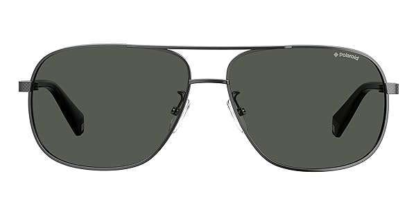 - Polaroid Sun Sunglass offers reliable performance and quality- Lightweight rectangular aviator sunglasses for men- Dark ruthenium metal front- Dark ruthenium metal temples with long matte black ends- Polaroid Logo printed on the connectors