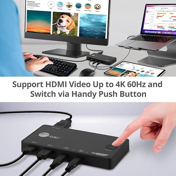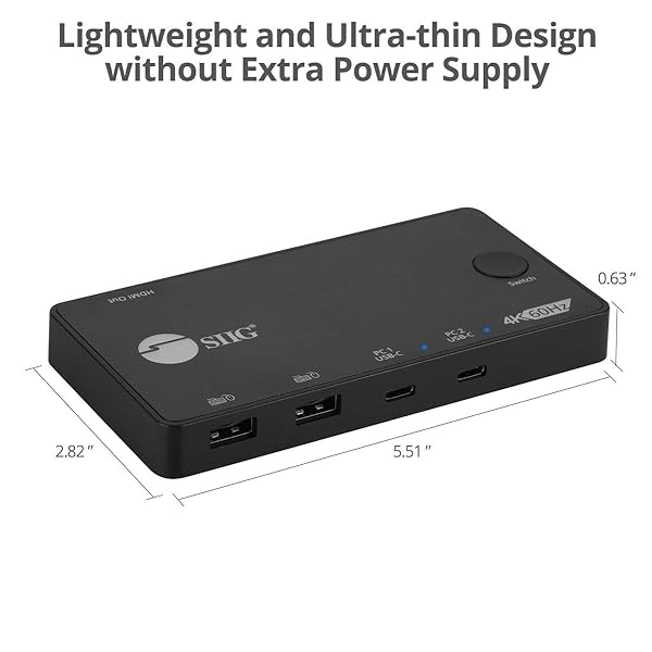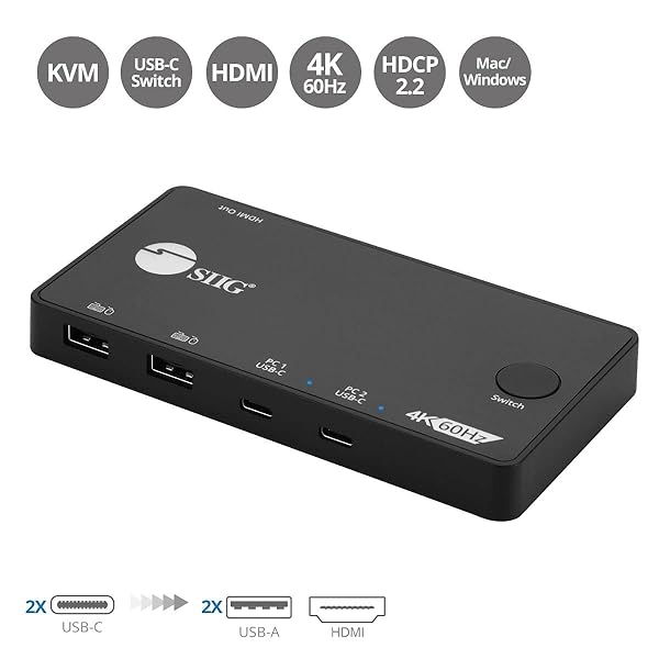 * SIIG 2 Port USB-C KVM Switch - 2 Computers to 1 Monitor - 2X USB-A + 2X USB-C - Single 4K 60Hz HDMI, USB-C Bus Powered, Button Control, Thunderbolt 3 Compatible (CE-KV0B11-S1): all-in-one workstation * This 2-Port USB-C KVM Switch allows users to control & switch between 2 USB-C-based laptops * Computers * Mobile devices * Or tablets from a single user station