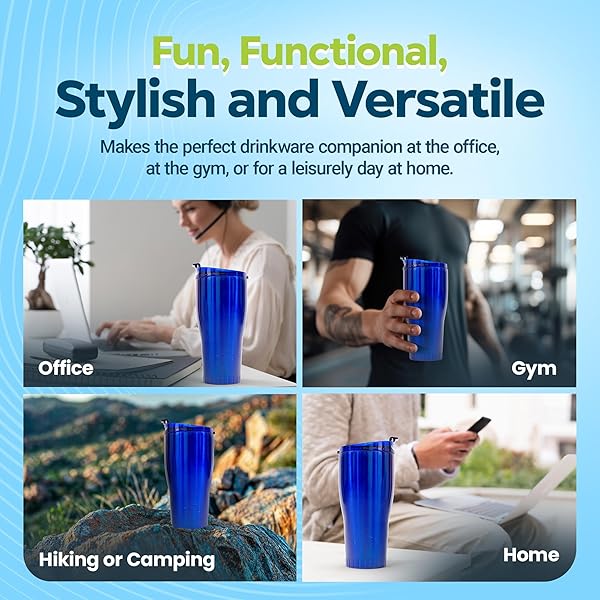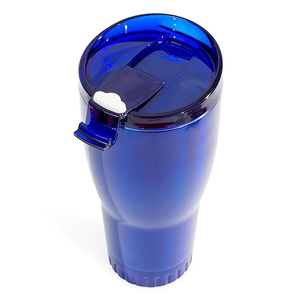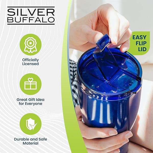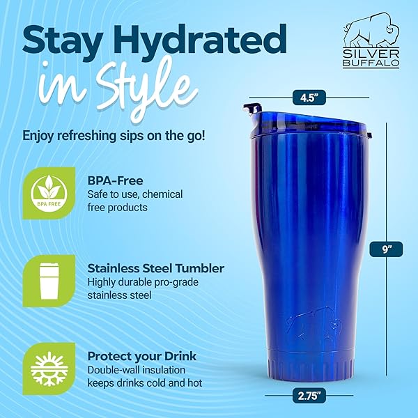 * Silver Buffalo Double Walled Vacuum Insulated Stainless Steel Tumbler With Flip Top Lid Keeps Hot and Cold, Travel Coffee Mug Leakproof Lid, 30 Ounces, Royal Blue: made of 18/8 stainless steel and keeps beverages hot for up to 4 hours and chilled for up to 18 hours * The double wall feature also prevents condensation * Retaining the temperature of your beverage inside the bottle * This drinking tumbler is leakproof and shatter resistant * Safe in backpacks