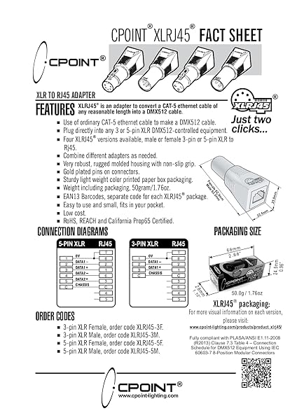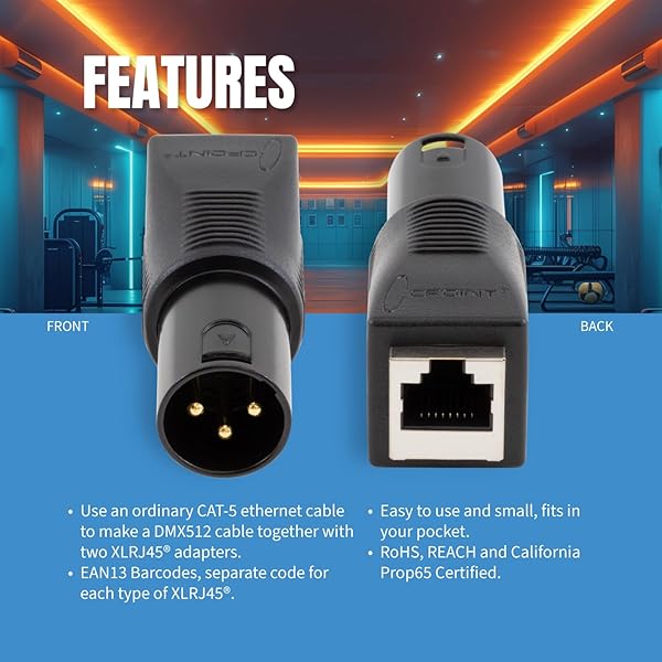 - SIRS-E 2-Pack - CPoint XLR RJ45 Adapter CAT-5 Ethernet to DMX512 Cable Converter, Male 3-Pin, XLRJ45-3M provides reliable performance and quality- Adaptor to convert DMX XLR 3-Pin Male to RJ45- Very robust, rugged molded housing with non-slip grip- Gold plated pins on connectors- Use of ordinary CAT-5 ethernet cable to make a DMX512 cable