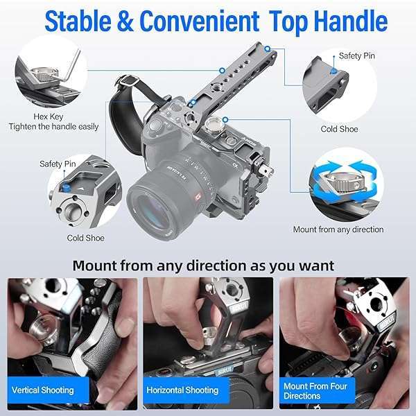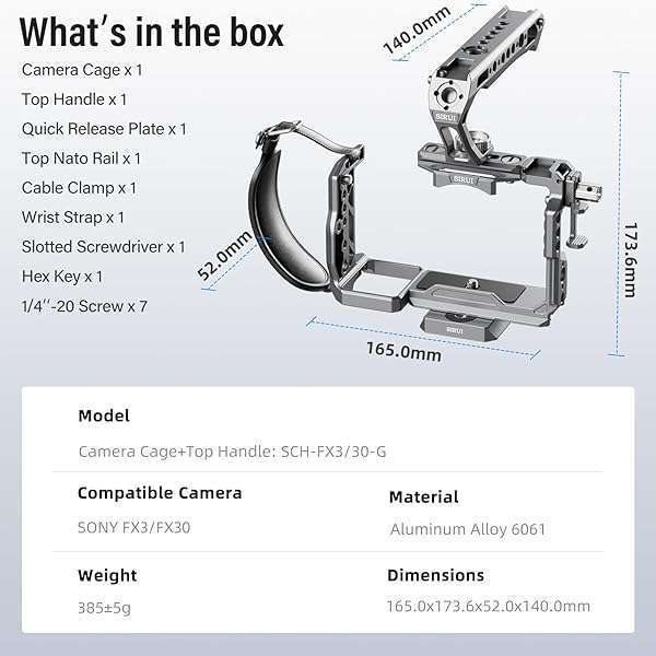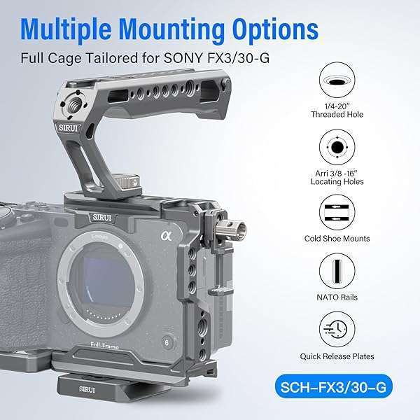 * SIRUI Camera Cage Kit for Sony FX 3 FX30 with Top Handle Wrist Strap Cable Clamp for HDMI NATO Rail, QR Plate for Arca-Swiss, Modular Design Compatible with Sony XLR Handle, Grey: designed for sony fx3/fx30: perfectly tailored design * Abundant modular expansion slots * Built-in features including 1/4" threads and 3/8" threads with locating holes for ARRI * Cold shoe * And quick release plate for Arca-Swiss at bottom