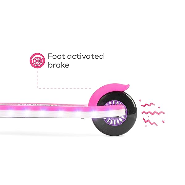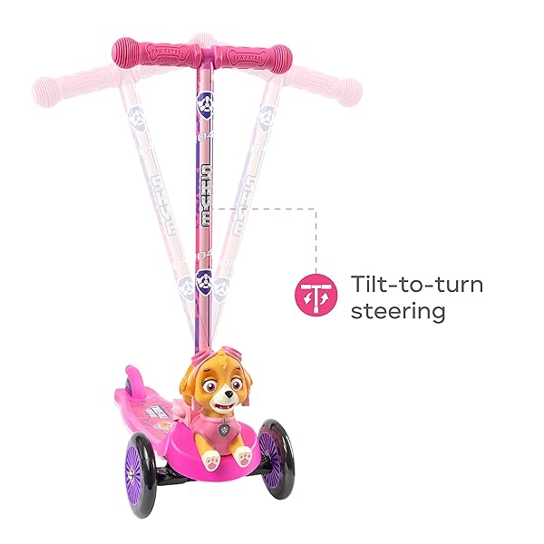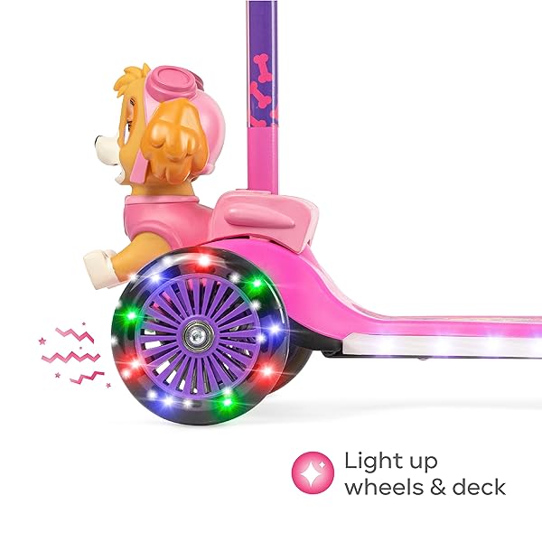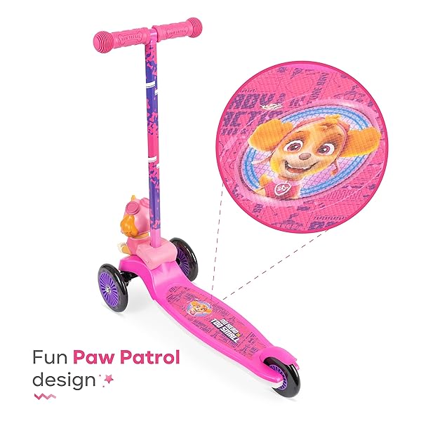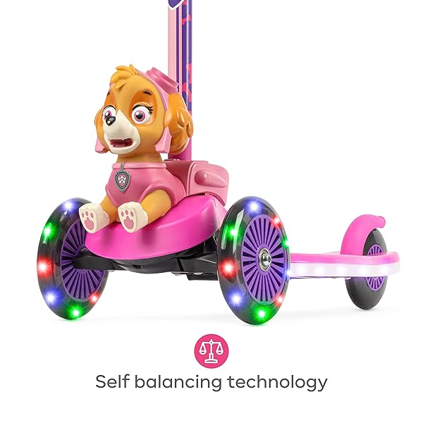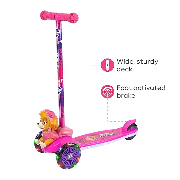 * Paw Patrol Skye Kick Scooter for Kids, Self-Balancing 3 Wheeled Light Up Scooter with Extra Wide Anti-Slip Deck, Rear Brake, Lean to Steer, Lightweight Design, for Kids 3 and up, 75 LB Limit: unique 3 wheel design: the paw patrol skye kick scooter is designed with 3 heavy duty * Durable wheels that offer a smooth * And very steady ride * Ride comfortably on both smooth and uneven surfaces with ease * Self-Balancing for Stress Free Riding: This Scooter is built to take the worries of losing