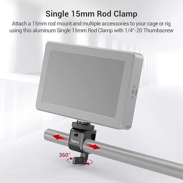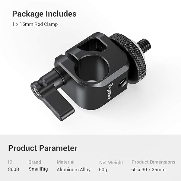 - SMALLRIG 15mm Rod Clamp Rail Connector with 1/4" Thread Hole to Attach Camera Microphones/Sound Recorders/Lighting Equipment - 860 provides reliable performance and quality- SINGLE ROD CLAMP SmallRig Single Rod clamp 860 is designed for 15mm rods on DSLR Rig. It features a single rod clamp with a standard 1/4 knurled screw.- FOR 15MM ROD The single rail block rod clamp can be mounted on any standard 15mm rods on DSLR rigs.