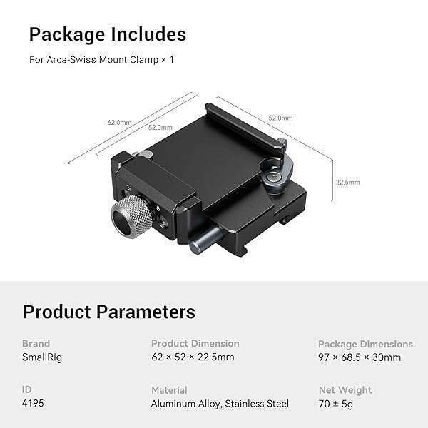 * SMALLRIG RS 3 Mini Quick Release Clamp for DJI RS 3 Mini, for Arca-Swiss Mount Clamp - 4195: for dji rs 3 minismallrig mount clamp is specially designed for dji rs 3 mini gimbal * This mount clamp supports camera cage with a bottom plate for Acra-Swiss * Lower Center of GravityWhen you install the quick release clamp * The overall center of gravity drops by 10mm * Making it easier to level and be compatible with heavier cameras