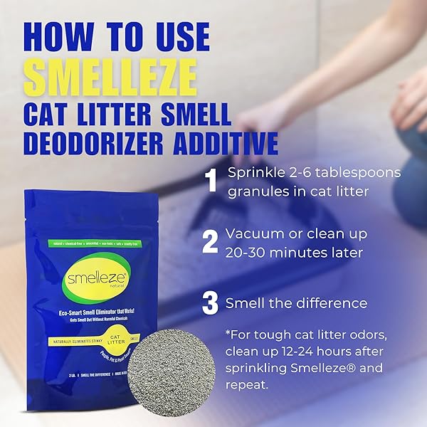 - SMELLEZE Natural Cat Litter Deodorizer and Litter Box Odor Eliminator Additive for Strong Smells Unscented Kitty Litter Smell Control Safe Long-Lasting Granules for Multi Cat Homes 2 lb offers reliable performance and quality- ELIMINATES LITTER BOX ODOR AT THE SOURCE: Dont just mask odors neutralize them with our cat litter odor eliminator. Designed to fight ammonia, urine, and feces smells in any cat litter box, this additive keeps your home fresh daily