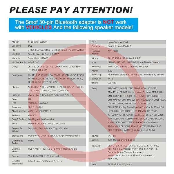 - Smof 30 Pin Bluetooth Adapter Receiver for Bose Sounddock iPod iPhone Music Docking Station and Other 30 Pin Dock Speakers Bluetooth Audio Receiver with 3.5 mm Audio Cable (Not for Car or Motorcycle) offers reliable performance and quality