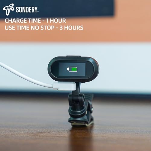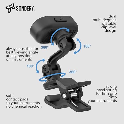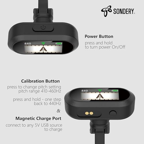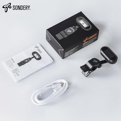 - Sondery Guitar Ukulele Tuner Clip On Rechargeable, Easy to Read Simple TFT Screen Extremely Fast and Accurate Tuning, Headstock Chromatic Tuner Pitch 410-460Hz, Perfect for Any Lighting with reliable performance and quality- ACCURATE TO TUNE - Sondery ClipTune tuner features an extremely accurate piezo transducer that detects the instrument's vibration via direct contact and accurately tunes in a flash without interference from ambient sound. A wide calibration range of 410-460Hz