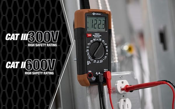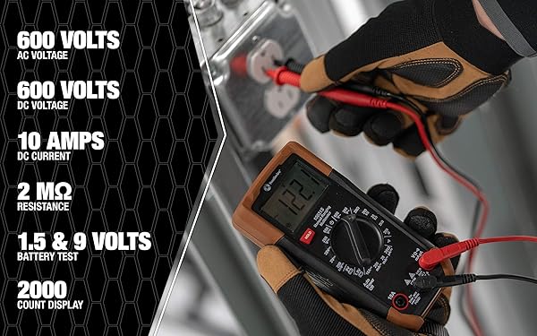 - Southwire 10031S Manual Multimeter, 0-600VAC, +/(1.2 percent +10) Accuracy, ABS, black Brown offers reliable performance and quality- 7 FUNCTIONS and 19 ranges: AC & DC voltage, DC current, resistance, continuity, 1. 5V and 9V battery test- RUGGED DOUBLE-MOLDED HOUSING: Southwires meters are designed to withstand the rugged environment of a worksite and have been drop tested up to 2 meters