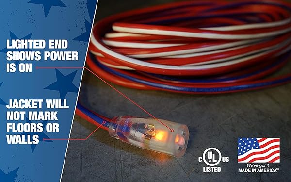 - Southwire 2547SWUSA1 25-Feet; Contractor Grade; 12/3; Lighted End Red White and Blue; American Made Extension Cord; Indoor and Outdoor Use; Water Resistant Flexible Jacket; Foot; Ft offers reliable performance and quality- MADE IN AMERICA: Display AMERICAS COLORS on the jobsite with this patriotic striped contractor grade extension cord