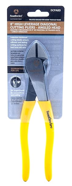 - Southwire DCPA8D 8" Angled Head High-Leverage Diagonal Cutting Pliers with Dipped Handles; Yellow offers reliable performance and quality- 8 high leverage Diagonal cutting Pliers: angled head Ideal for cutting hard and soft wires- Induction Hardened cutting blades: Durable blades; forged from drop forged CRV alloy steel; ensure efficient and lasting cutting surfaces for hard and soft wire