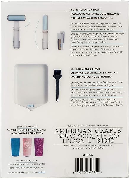 - We R Memory Keepers Spin It Glitter Clean Up Kit offers reliable performance and quality- The clean up roller is effective on desks, hard flooring, mats and other firm surfaces- Use the tray to catch excess glitter- It also doubles as a funnel for easy clean up and saving unused glitter- This 6x8.25x1.625 inch package contains one glitter clean up roller and one glitter funnel & brush