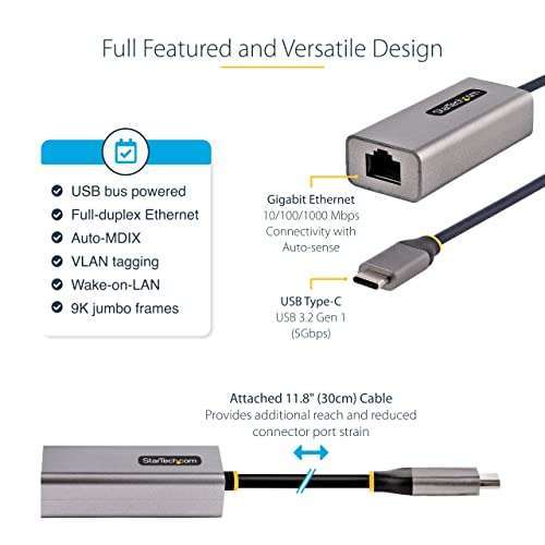 StarTech USB-C to Ethernet Adapter - 10/100/1000 Mbps, Driverless Install, 12in Cable - Fast Gigabit Network Solution