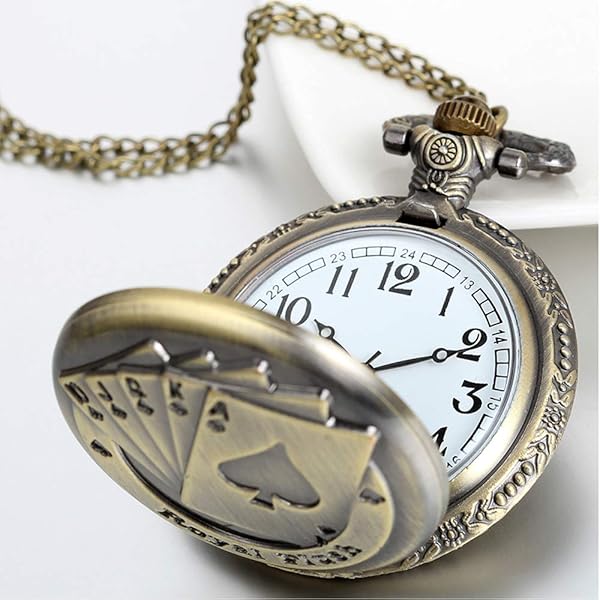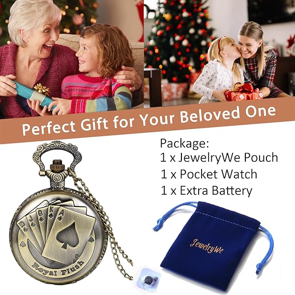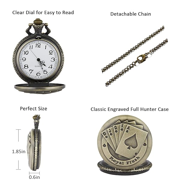 - JewelryWe Steampunk Antique Royal Flush Poker Cards Men Women Pocket Watch with 31.5" Chain offers reliable performance and quality- SIMPLE & COOL: Full Hunter Pocket Watch with Royal Flush Poker Cards, unique design, cool and charming. Simple and versatile, this watch featuring a minimalist design scheme is ideal for many occasions. The antique chain watch nicely balance a vintage charm with modern day convenience