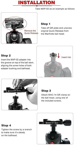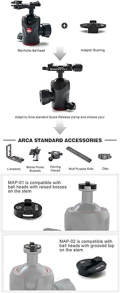* Sunwayfoto MAC-14T 60mm Clamp Conversion Kit Convert to Arca/RRS QR Compatible with Manfrotto Tripod Ball Head Sunway: converts virtually any manfrotto ball head to arca / rrs & retain manfrotto rc2 compatibility * Kit Includes: MAC-14 60mm Clamp * MAP-01 Adapter (Male Stem Convertor) * MAP-02 Adapter (Female Stem Convertor).2 M6 Screws * Allen Wrench