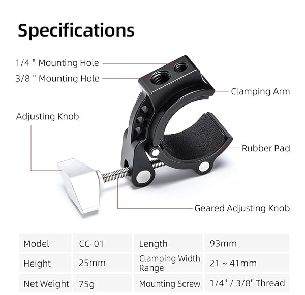 * SunwayFoto Titan Tube Clamp CC-01 Accessory/Magic Arm Mount w 1/4" & 3/8" Sockets Ideal for 32mm & 36mm Legs: ideal to fit 32mm & 36mm tubes / legs * Features 1/4" & 3/8" Female Mounting Sockets * Length: 93mm * Height: 25mm * Net Weight: 75g