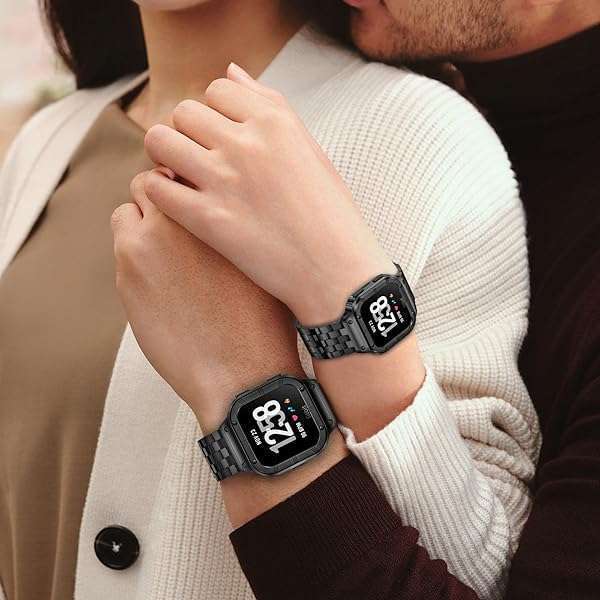 SUPLINK Stainless Steel Bands for Fitbit Versa 4, 3, 2 & Sense - Durable Black Watch Strap & Protector Cover for Men