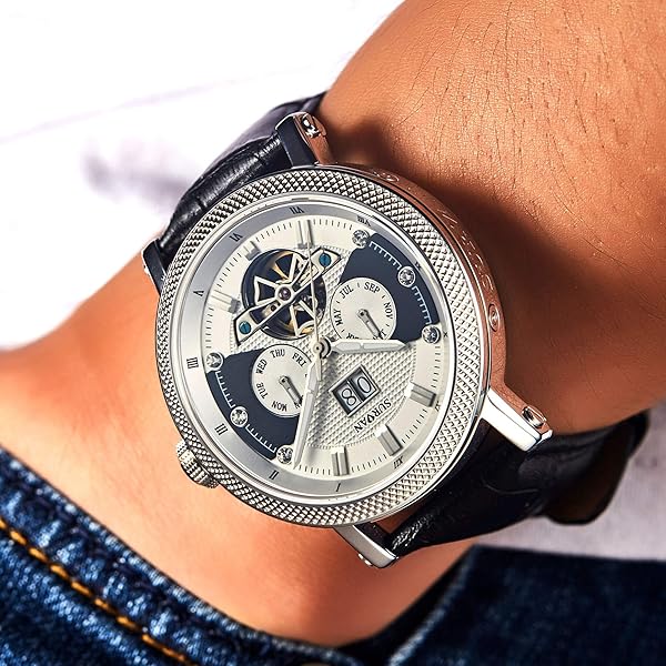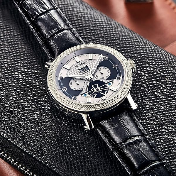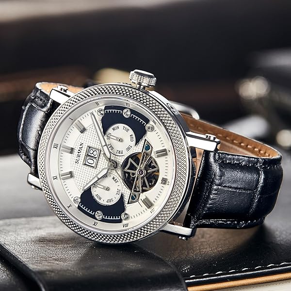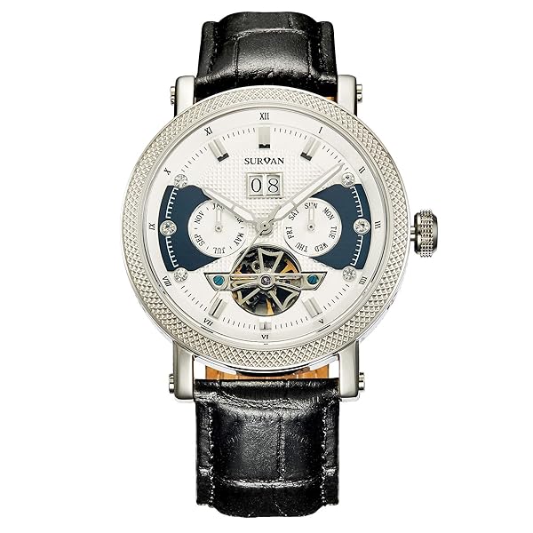 - SURVAN WatchDesigner Automatic Watches for Men, Genuine Leather Strap Mechanical Watch, Mens Skeleton Watch, Stainless Steel Case with reliable performance and quality- Luxurious Diamond & Skeleton Design -- Features the intricate skeleton tourbillon design showcasing inner mechanics, with luminous hands for clear visibility in low-light conditions. Elegant 18K gold-plated stainless steel case with diamond-accented dial. Paired with a genuine leather strap for comfort and scratch-