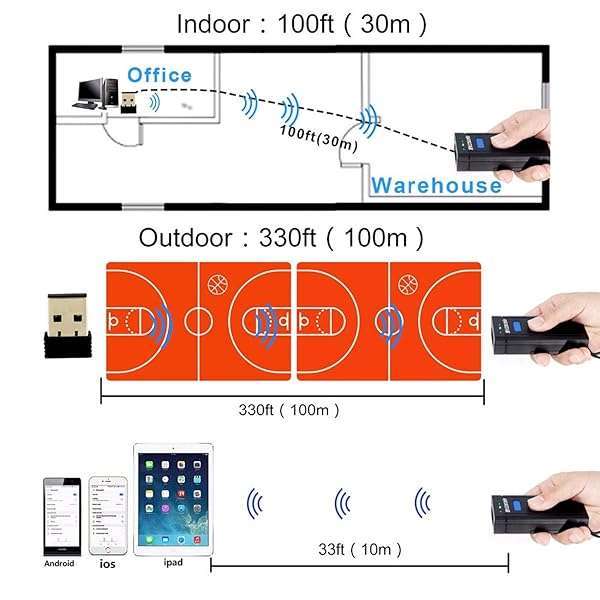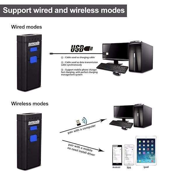 - Symcode Bluetooth Wireless Barcode Scanner,Compatible with Bluetooth Function & 2.4GHz Wireless, Portable Barcode Reader Work with Windows, Mac,Android, iOS Phones, Tablets or Computers offers reliable performance and quality- [2.4G Wireless & Bluetooth 4.1 & USB2.0 Wired Barcode Scanner]: 3-in-1 operation modes ,you can switching more conveniently