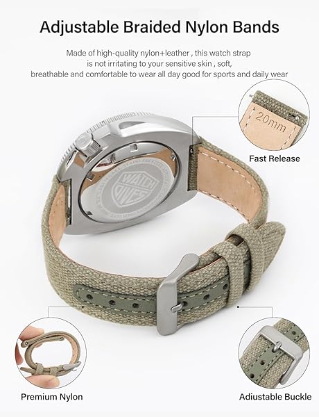 - TACTICAL FROG 20mm Fast Release Nylon Watch band Military Watch Straps with Stainless Steel Buckle, Two-Piece Waterproof Nylon + Leather Watchbands for Men and Women with reliable performance and quality- Waterproof Breathable: Our nylon watch band measures 1mm thick, lightweight and breathable for all day comfort. Dirt and Wet resistant features allow you to enjoy yourself while doing fitness, swimming or climbing- Laser Cut and Durable: Made of high density nylon and 316L