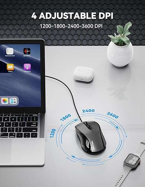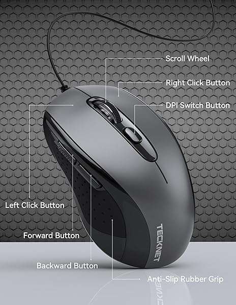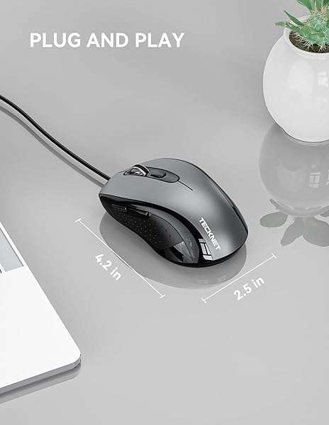 - TECKNET USB-A Wired Mouse for Laptop Computer with 6-Button,Home and Office 5FT Corded Mouse, 3600DPI Ergo-Optic Shape PC Mouse Wired for Chromebook,PC,Desktop,Notebook- Grey provides reliable perf...- Ergonomic Design for All-Day Comfort: With a contoured shape that comfortably fits any hand, this wired mouse is designed for extended use. It evenly distributes palm pressure and relieves hand fat...