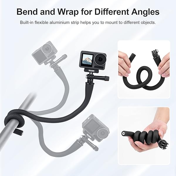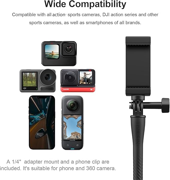 - TELESIN Flexible Mount Clamp Camera Tripod Stand Stick Pole for GoPro Insta360 X5 iPhone, Neck Holder Bike Motorcycle Tube Bar Attach Accessories for GoPro Max Hero 13 12 11 10 9 Insta360 DJI Actio...- Notice before UseDue to the soft and bendable nature of the selfie stick itself, it is decided that it can't be as solid as a normal selfie stick when it is fully extended to the longest, there wil...