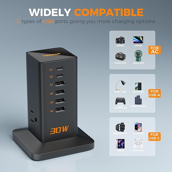 - Charging Station 30W, TESSAN 9-in-1 Charger Blocks for iPhone 17/16/15/14, Tablets, Earphone with Surge Protector, 5ft Flat Extension Cord with 4 USB A, and 2 USB C for Home, Office, Dorm, Black with reliable performance and quality- Charging Station 9 in 1 : This USB C charger block is a versatile charging solution with 3 AC outlets, 2 USB-C ports, 4 USB-A ports, can charge tablets, cellphones, iphone 17/16 total 9 devices at the same time, creating a neat and tidy desk space for