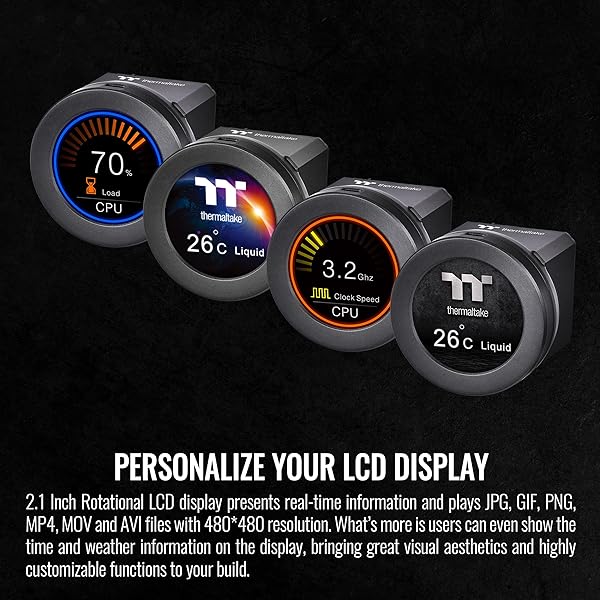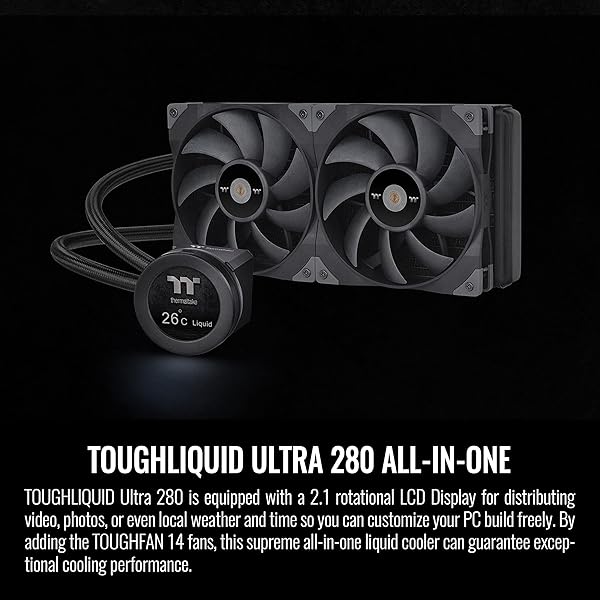 * Thermaltake TOUGHLIQUID Ultra 280 CPU Liquid Cooler, AMD(AM5/AM4) Intel(LGA 1700/1200), 2.1 Inch Rotational LCD Display 2000RPM Radiator Fan, TT RGB Plus 2.0. Software, CL-W374-PL14BL-A ,Black: toughliquid ultra 280 is equipped with a 2.1 rotational lcd display for distributing video * Photos * Or even local weather and time so you can customize your PC build freely * By adding the TOUGHFAN 14 fans * This supreme all-in-one liquid cooler can guarantee exceptional cooling performance