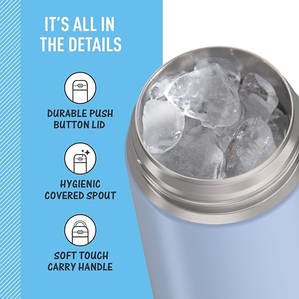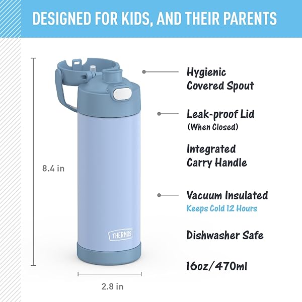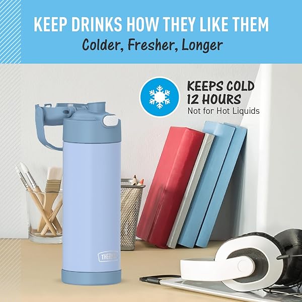 * THERMOS FUNTAINER 16 Ounce Stainless Steel Vacuum Insulated Bottle with Wide Spout Lid, Electric Blue: the funtainer 16-ounce vacuum insulated stainless steel water bottle with spout keeps drinks cold for up to 12 hours * Our kids water bottles are built so their drinks are as cool on the inside as they look on the outside * Kids stay hydrated and parents stay happy * The double wall stainless steel construction is built to handle drops * Dings and assorted roughhousing