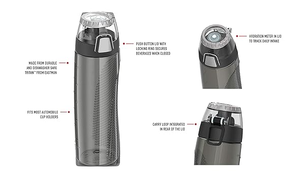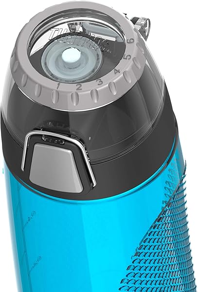 - Thermos Intak 24-Ounce Tritan Hydration Bottle with Meter (Teal), One Size, offers reliable performance and quality- Made from BPA-free, impact resistant and dishwasher durable Eastman Tritan copolyester material- Leak proof lid with one handed push button operation and flip up carrying loop- Easy opening hygienic push button sipper lid with locking ring- Rotating meter lets you monitor your daily water consumption