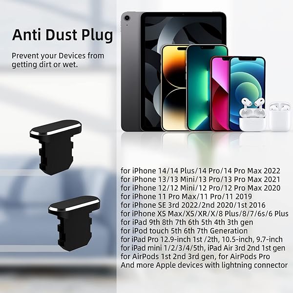 - TITACUTE 5-Pack Anti Dust Plug for iPhone 14 Pro Max 13 12 11 XR XS X SE 8 Plus 7 6 5 5S Dust Plugs for Lightning Charging Port Cover Protector Cap 8 Pin Dust Plug for iPad Pro Mini Air for AirPods with reliable performance and quality- Dust Plug for Lightning Port: Perfectly Compatible with Apple Device with Lightning Charging port, Designed for iPhone 14/14 Pro/14 Plus/14 Pro Max/13/13 Mini/13 Pro/13 Pro Max/12/12 Mini/12 Pro/12 Pro Max/11 Pro Max/11 Pro/11/SE/XS Max/XS/XR/X/8/7