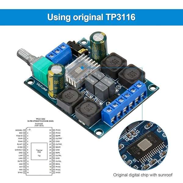 - 2Pcs Digital Amplifier Board,TPA3116D2 Dual Channel Audio Stereo AMP High Power Digital Subwoofer Power Amplifier Board 2x50W 5V 12V 24V for Store Solicitation Home Theater Square DIY Speakers prov...- The power amplifier board is made of high performance Original chip TDA3116D2, 2 channel stereo amplifier, 2x50W output power;- This digital amplifier is made of Use high-performance inductors and high-performance capacitors.