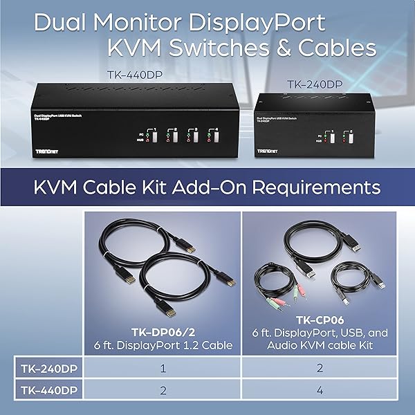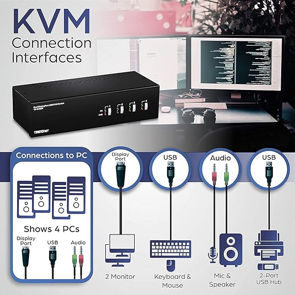 - TRENDnet 4-Port Dual Monitor DisplayPort KVM Switch With Audio, 2-Port USB 2.0 Hub, 4K UHD Resolution Up To 3840 x 2160, Connect 4 DisplayPort Monitors, Dual Monitor 4 Port KVM Switch, Black, TK-440DP offers reliable performance and quality