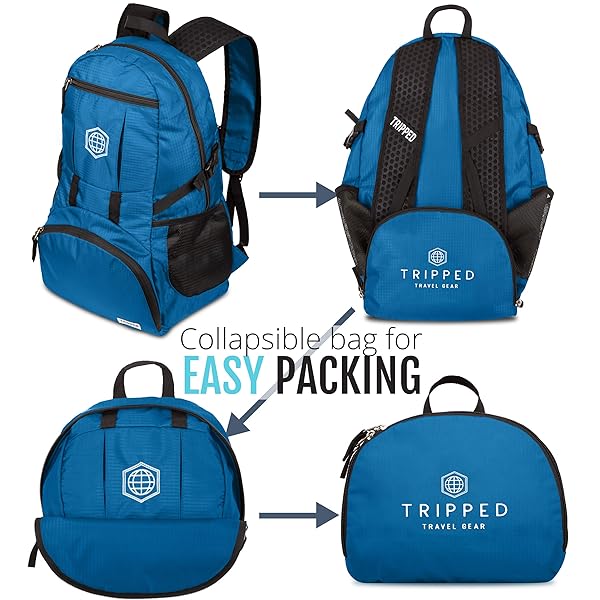 * TRIPPED Travel Gear Traveling Backpack- Foldable Collapsible Lightweight Backpack for Travel (Light Blue) 35 liters: packable: this daypack is collapsible * Foldable * And packable * Great to bring along on vacations to use as your daily camera bag * Simply fold up daybag and toss into your suitcase or carry on luggage and use it at your destination