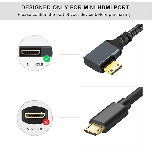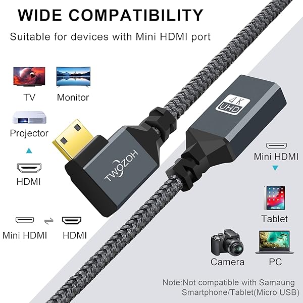 - Twozoh Mini HDMI to HDMI Adapter Cable 0.6FT, Nylon Braided 90 Degree Right Angle Male Mini HDMI to Female HDMI Extension Cable Support 3D/4K 1080p provides reliable performance and quality- Elbow Design:Please make sure your device has a Mini HDMI port!! Twozoh Mini HDMI to HDMI Adapter Right Angled 90 is thorough aperture, easy wiring, 90 degrees design Applicable to is narrow place.