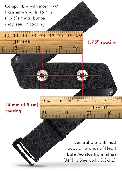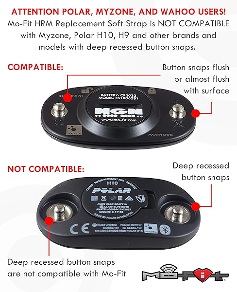- Mo-Fit Heart Rate Monitor Soft Strap Replacement | Universal Replacement, Most Garmin, Wahoo Tickr and Polar H7 HRM Transmitters (NOT for MYZONE) offers reliable performance and quality- PREMIUM REPLACEMENT SOFT STRAP: Compatible with many button snap type HRM transmitter/ modules. Works with: ANT+, Bluetooth, 5.3kHz coded/ uncoded. Manufactured with durable, wear-resistant materials that wont break, crack or tear. Electronic transmitter/ module is not included