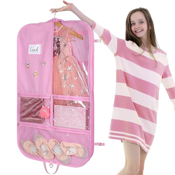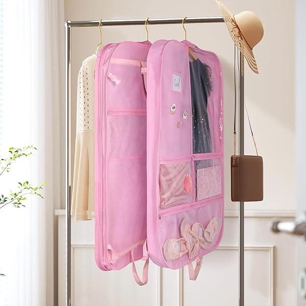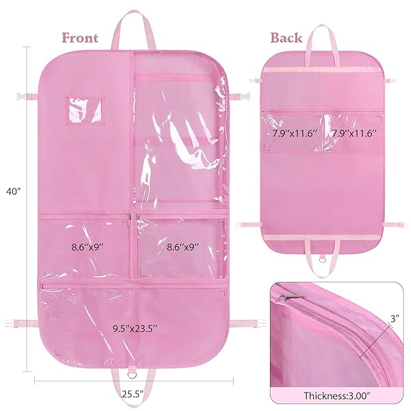 - Univivi Pink Garment Bags for Dance Costumes 40 Inch Dance Costume Garment Bag for Girls, 3 Medium Clear Zipper Pockets and 2 Back Zippered Pocket, with 1 xPendant, 3 x Badge with reliable performance and quality- QUALITY FABRIC -The front of kids dance garment bag is made of PVC material, and the back is designed with breathable non-woven fabric, durable, odorless, breathable for long time use.- MULTIPLE ZIP POCKETS - The dance costume bag comes with 3 transparent pockets,