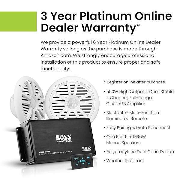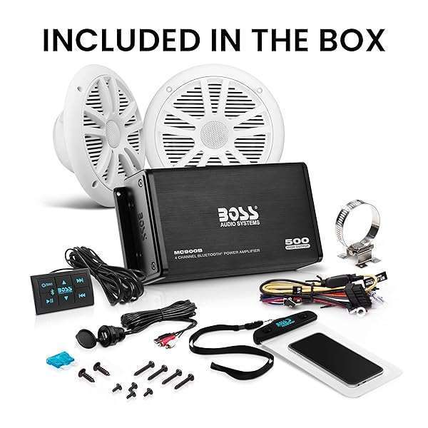 - BOSS Audio Systems ASK902B.6 Marine Boat 6.5 inch Speakers and 4 Channel Amplifier Package - 500 High Output, Bluetooth Remote, Waterproof Pouch provides reliable performance and quality- Power - 125 W Max x 4 @ 4-Ohms, 94 W RMS x 4 @ 4-Ohms. USB charging port available. 4-8 Ohm Stable with RCA Outputs