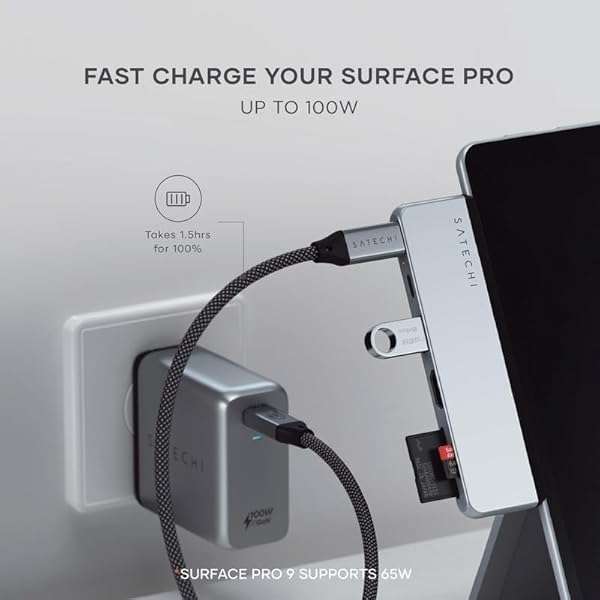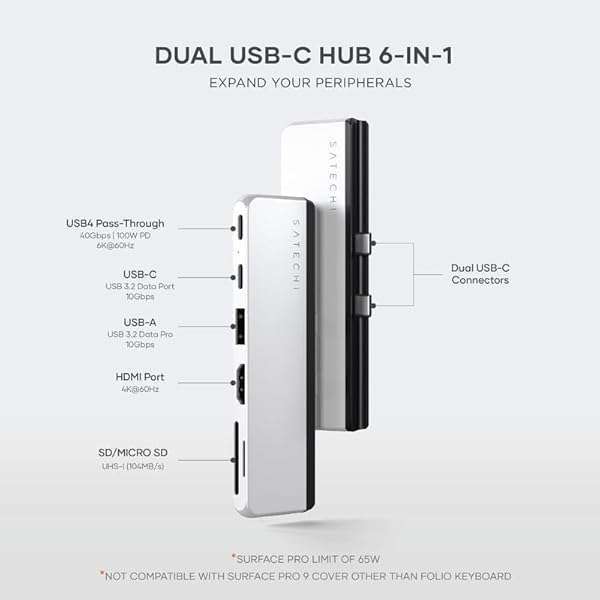 - Satechi Dual USB-C hub for Surface Pro 11/10/9, Docking Station with 3.2 USB-A, 4k/60Hz HDMI, USB4 Pass-Through, 3.2 USB-C, UHS-I SD/TF Card provides reliable performance and quality- Powerful Ports Expansion Seamlessly attaches to Surface Pro 11/10/9, adding 6 ports: USB4 pass-through, USB-C 3.2 Gen 2, USB-A 3.2 Gen 2 (10Gbps), HDMI 2.0, and SD/microSD UHS-I card slots. The US...