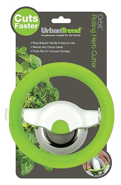 * Urban Trend Orbit Rolling Herb Cutter and Mincer, Green/White: cutting through all fresh herbs with ease * The Orbit Rolling Herb Cutter can be palm-held for single-handed cutting or two-handed leveraged-held for cutting through thick stalks of Rosemary or large bunches of Chives and Basil * The patented Orbit safety ring serves as both a leveraged cutting handle and * With a push of a button * For fold-flat compact storage