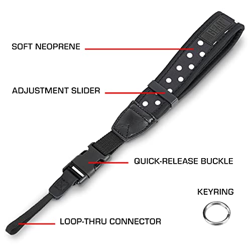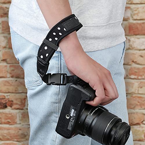 USA GEAR Neoprene Camera Wrist Strap - Comfortable Quick Release for Canon, Nikon, Sony & More - Polka Dot Design