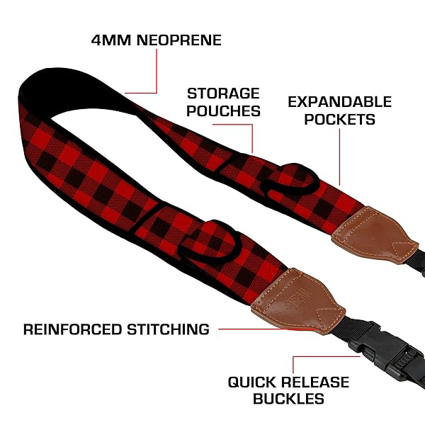 - USA Gear TrueSHOT Camera Strap Neoprene Camera Straps - Padded Neck Strap, Pockets, and Quick Release Buckles - Compatible with Canon, Nikon, Sony and More DSLR and Mirrorless Cameras (Red Plaid) offers reliable performance and quality- VERY COMFORTABLE STRETCH NEOPRENE padded system distributes the weight evenly across your shoulders and back for all day use | CUSTOM DESIGNED PATTERN adds a colorful and unique style for extra swag