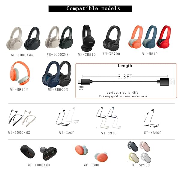- USB C Charger Charging Cable Cord for Sony WH-1000XM4 WH-1000XM5 WF-1000XM4 WH-1000XM3 WH-XB700 WI-C100 C200 310 WH-XB900N WI-XB400 WH-CH510 WH-H910N WH-H810 WF-SP900 SBH24 WF-C500 Headphones Earbu...- Professional charging cable is for Sony WI-C100 WH-1000XM5, WF-1000XM4 WH-H910N WH-1000XM3 WF-1000XM3 WH-H810 WH-XB700 WI-1000XM2 WI-C200 WF-SP900 WH-XB900N WI-1000XM2 WI-XB400 WH-CH510 WI-C200, WI...