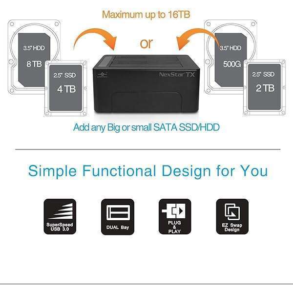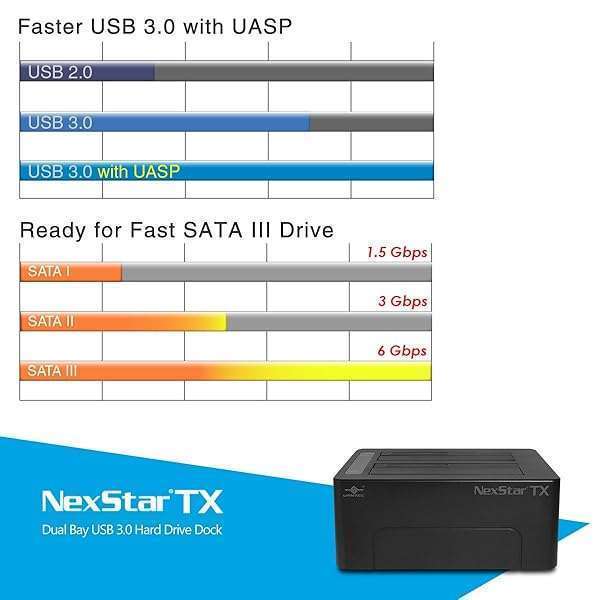 - Vantec NexStar TX Dual Bay USB 3.0 Hard Drive Dock (NST-D428S3-BK) offers reliable performance and quality- Clear LED activity indicator- SuperSpeed USB 3.0 transfer rates of up to 5Gbps, backward compatible with USB 2.0/1.1- Hot-swappable: Plug & play without Rebooting- Support two bigger capacity drives*