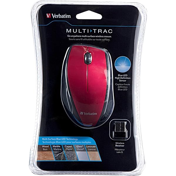 - Verbatim Wireless Multi-Trac Mouse 2.4GHz with Nano Receiver - Ergonomic, Blue LED, Portable Mouse for Mac and Windows - Red offers reliable performance and quality- Multi-surface mouse featuring Blue LED sensor technology and efficient low power (battery included)- Blue LED technology allows for use on virtually any surface including glass desk surface, hardwood floors, & granite counter tops with precision and control