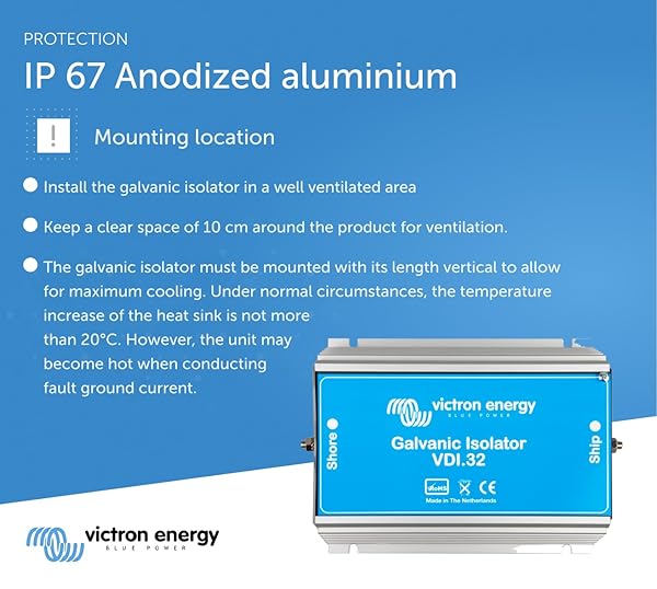 - Victron Energy Galvanic Isolator VDI-32 amp offers reliable performance and quality- Victron Energy galvanic isolator prevents electrolytic corrosion- It blocks low voltage DC currents that enter your boat via the shore power earth wire. These currents can cause corrosion to the boat underwater metals, like the hull, propeller, shaft and so on