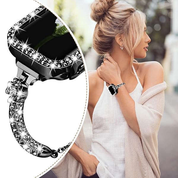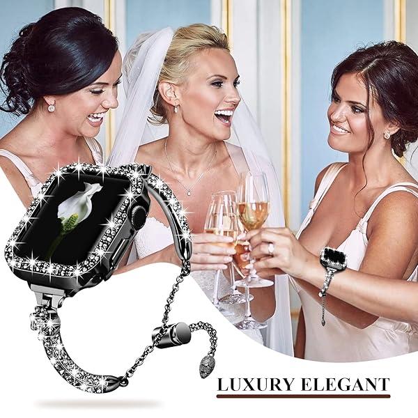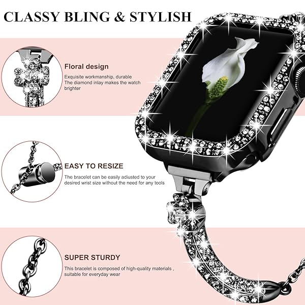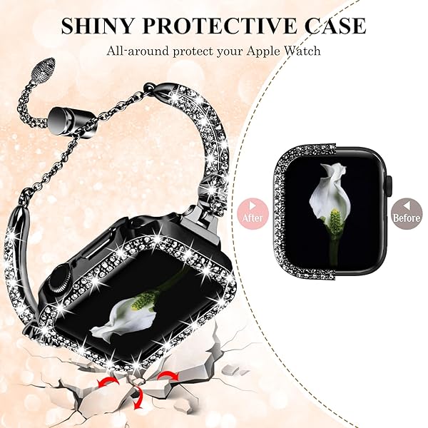 - VIQIV Bling Band and Cover Compatible with Apple Watch Band 38mm 40mm 41mm 42mm 44mm 45mm iWatch SE Series 7 6 5 4 3 2 1 for Women, Cute Luxury Dressy Metal Bracelet with Rhinestone Bumper Case with reliable performance and quality- Compatible with Apple Watch Band 38mm 40mm 41mm 42mm 44mm 45mm SE Series 7/6/5/4/3/2/1; Fit 5.5"-8.1" wrist.- Well polished and crafted stainless steel wraps with shiny rhinestones, makes it a sleek and robust daily companion- Comes with