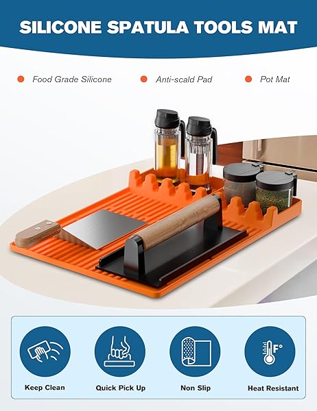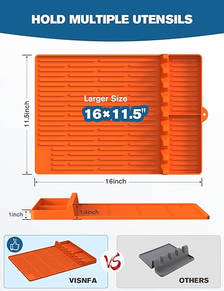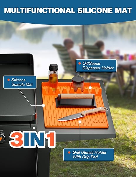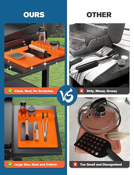 - visnfa Silicone Griddle Tools Mat for Blackstone, Heat Resistant Spatula Mat, BBQ Grill Tool Rest, Silicone Grill PadBlackstone Griddle Accessories for Kitchen, Cooking & CountertopOrange with reliable performance and quality- Large Size Grill Side Shelf Mat: Package includes 1 x large size 15.5 x10.5" silicone spatula mat with drip pad. Suitable for Blackstone, Weber, Cuisinart, Charcoal, Napoleon, Broil King, Nexgrill grills with side shelves. Suitable for kitchen, cooking and c