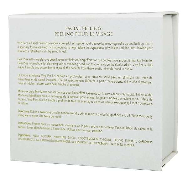 - Vivo Per Lei Facial Peeling Gel - Contains Dead Sea Minerals and Nut Shell Powder - Gentle Face Exfoliator Scrub and Blackhead Remover - Peel Your Skin to a Fresher You - 4.05 Fl oz. provides relia...- GENTLY EXFOLIATES - The Vivo Per Lei Facial Peeling Gel exfoliates gently without hurting or irritating skin. The Dead Sea Facial scrub works well even on dry, oily or sensitive skin.