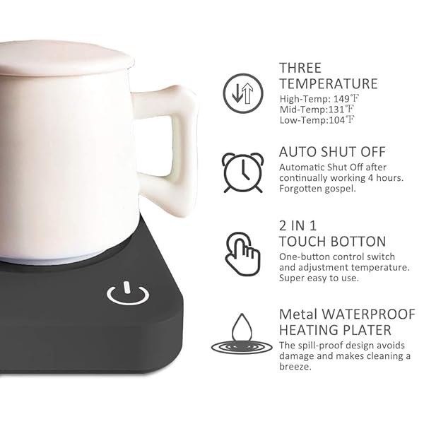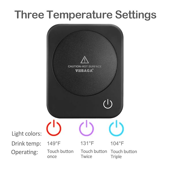 - VOBAGA Coffee Mug Warmer, 4 Hours Auto Shut Off Cup Warmer for Office Home Desk Use with 3 Temperature Settings, Electric Beverage Warmer for Cocoa,Tea, Milk, Soup, Gift (No Cup) offers reliable performance and quality- 3-Temperature Settings: Our coffee mug warmer can slow down the cooling speeds of hot beverage; You can choose the temperature by touching the Power Button to keep or warm up the liquid temperature to 149/65 or 131/55 or 104/40