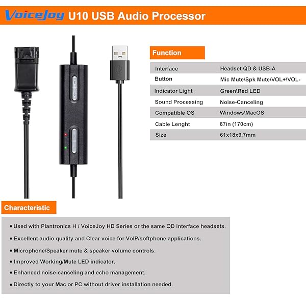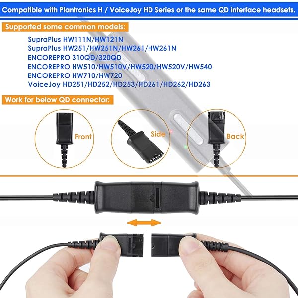 - VoiceJoy Headset QD(Quick Disconnect) Connector to USB Adapter with Volume Adjuster, Mute for Speaker and Microphone Separately Compatible with Any Plantronics Headset QD Plug: reliable performance and quality- Compatible with all QD plugs like Plantronics. NOT FOR GN headsets as the photo shows.- Plug-and-play USB interface - no drivers needed.- Volume adjuster for Speaker.- Mute for Speaker and Mute for Microphone separately.